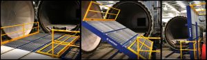 Quickstep Technologies in Milperra Sydney manufacture quality aircraft equipment including body parts. They use large autoclaves to set the carbon fibre pieces once they have been moulded. These pieces are placed on large trolleys and pushed into the autoclaves. The materials handling team used an inefficient and unsafe bridging platform to bridge the gap between the floor level and the autoclave. Due to the site restrictions in clearances, Safetech had to innovate two types of bridging platforms that not only could take the heavy loads requires (9000 kgs) but be able to manoeuvre out of the way to allow the autoclave doors to close